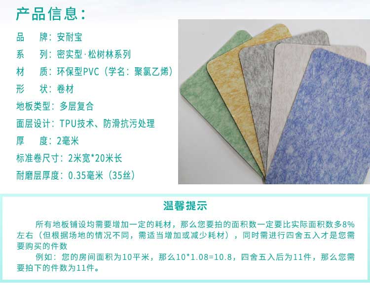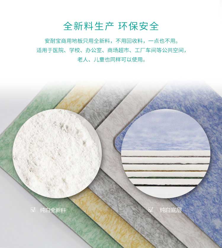 安耐寶pvc地板只用全新料,不用回收料,一點也不用。適用于醫院、學校、辦公室、商場超市、工廠車間等公共空間老人、兒童也同樣可以使用。