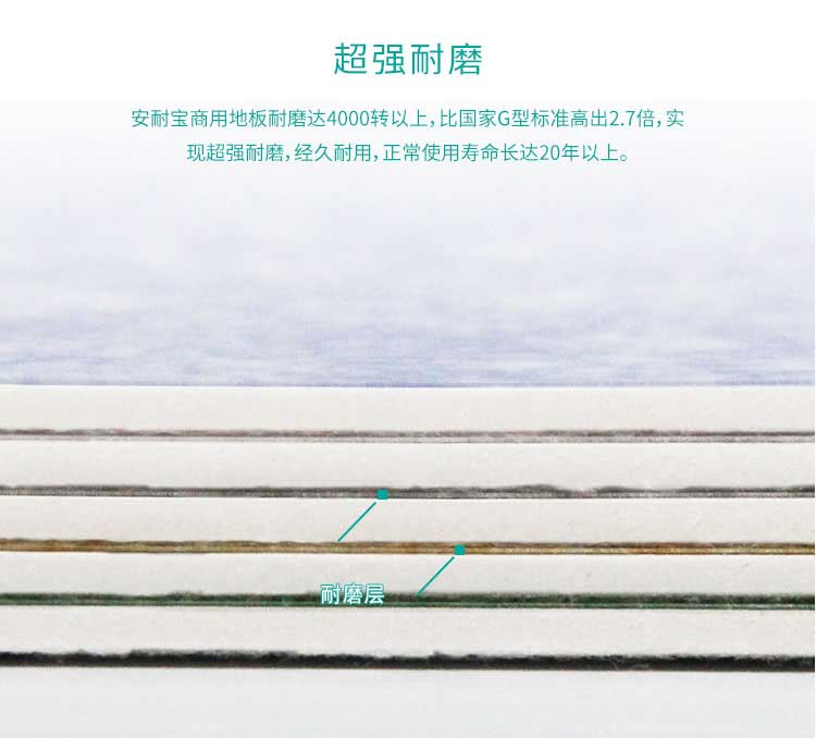 安耐寶pvc地板耐磨達4000轉以上,比國家G型標準高出2.7倍,實現超強耐磨,經久耐用,正常使用壽命長達20年以上。