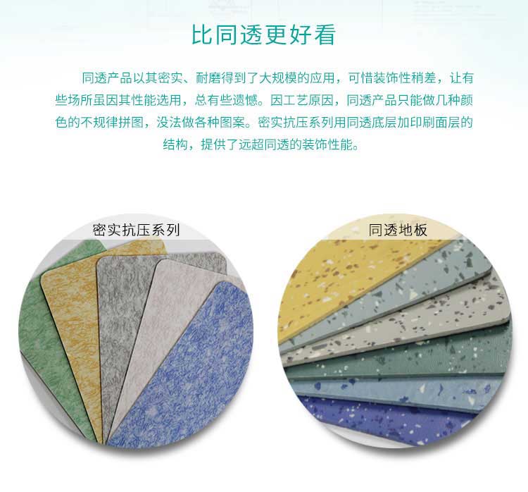 同透產品以其密實、耐磨得到了大規模的應用,可惜裝飾性稍差,讓有些場所雖因其性能選用,總有些遺憾。因王藝原因,同透產品只能做幾種顏色的不規律拼圖,沒法做各種圖案。密實抗壓系列用同透底層加印刷面層的結構,提供了遠超同透的裝飾性能。
